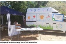Au volant de sa camionnette prénommée Georgette, Isabelle sillonne les villes et les villages entre Montpellier et Nîmes pour promouvoir l’antigaspi et le zéro déchet en proposant des ateliers de recyclage, de transformation d’objets et de vêtements et de fabrication de produits ménagers écologiques.