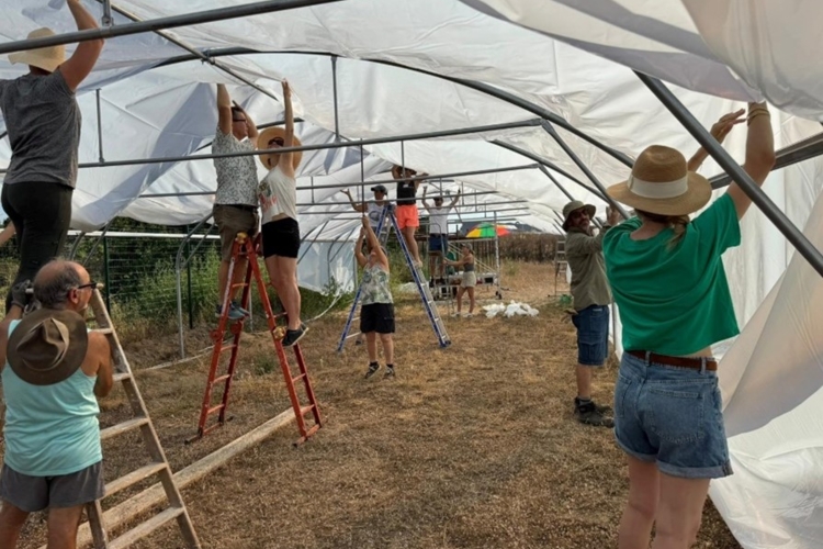 Photo de couverture : pose de la bâche de la serre dans el cadre d’un chantier solidaire.